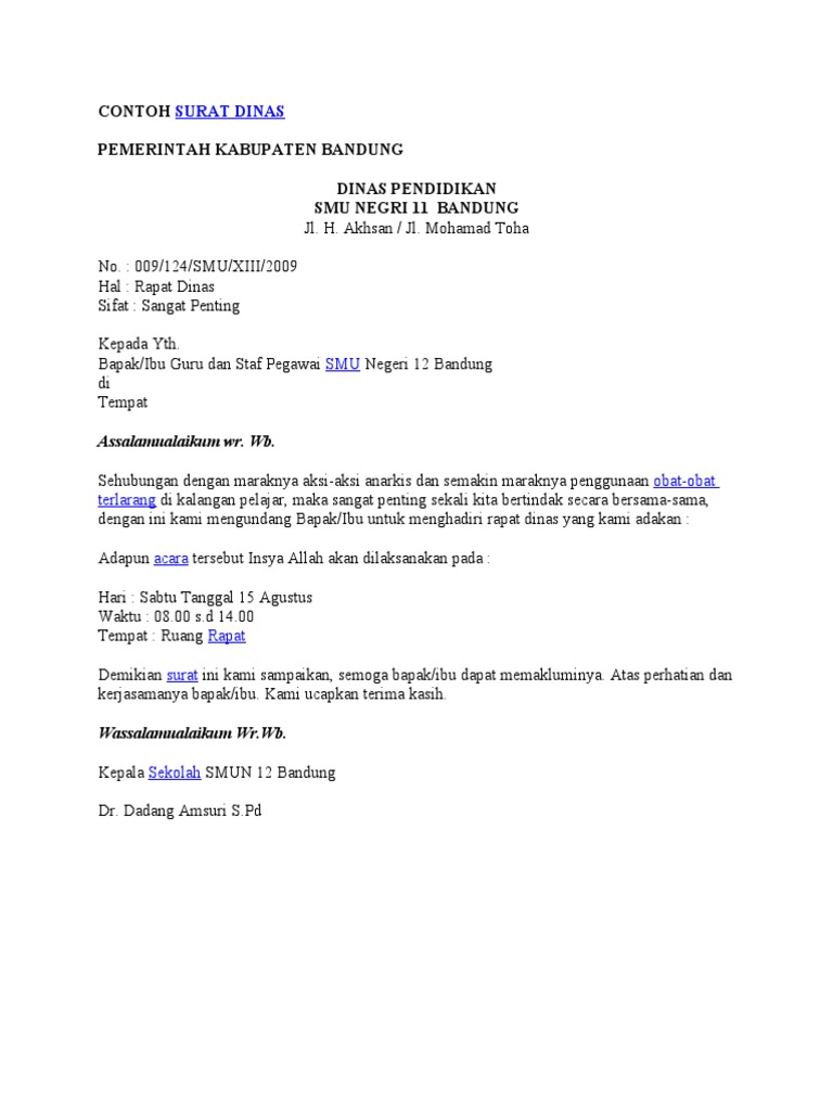 Share & embed contoh surat dinas.docx. Berikut adalah kumpulan contoh surat dinas berbagai keperluan yang baik dan benar sesuai dengan kaidah struktur. Dalam tata naskah dinas kementerian luar negeri dan perwakilan ri di luar negeri, lambang negara yang dicetak di kepala surat terdapat dua macam warna, yaitu warna emas dan warna biru. Please copy and paste this embed script to where you want to embed. Berikut adalah contoh surat dinas lainnya seperti surat dinas laporan, surat dinas permohonan, surat dinas undangan dan surat dinas perintah dalam versi pdf Bentuk ini merupakan yang paling sering dipakai. Pernyataan melaksanakan tugas praja indisipliner. Untuk mendapatkan file contoh surat perintah perjalanan dinas (sppd) yang tidak diproteksi dan bebas untuk diedit, silahkan anda kunjungi situs jika kemudian hari isi pernyataan ini tidak benar, kami bersedia bertanggung jawab. Surat dinas dibuat oleh instanti swasta ataupun negri, seperti yang kalian sudah ketauhi yaitu perusahaan pemerintah. Biasannya surat ini dibuat oleh suatu instansi baik swasta maupun negri seperti sekolah, kantor pemerintahan maupun perusahaan swasta. Walaupun esksistensi surat memang sudah lumayan menurun dikarenakan canggihnya teknologi, namun masih banyak pihak. Surat undangan pengajian pernikahan merupakan salah satu bentuk surat undangan tidak resmi yang biasanya ditujukan kepada keluarga dan warga sekitar. Dalam rangka memenuhi keperluan karyawan di kantor cabang yogyakarta, maka direktur pt.
