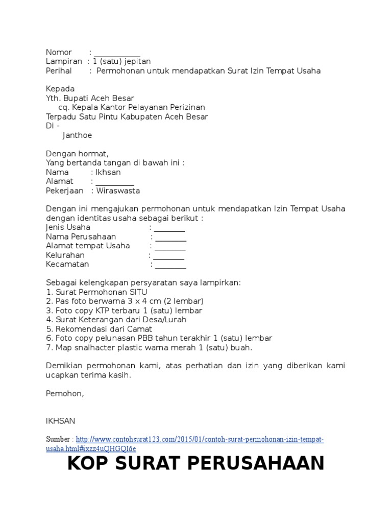 Dokumen ini harus dimiliki oleh para pengusaha yang memiliki modal berkisar rp 5 juta sampai. Contoh surat izin penggunaan tempat. Contoh surat izin sakit tidak masuk sekolah. Kepala kantor perizinan surat izin tempat usaha (situ/ho) terpadu kab. Demikianlah beberapa format dan contoh surat izin yang baik dan benar untuk berbagai macam alasan.