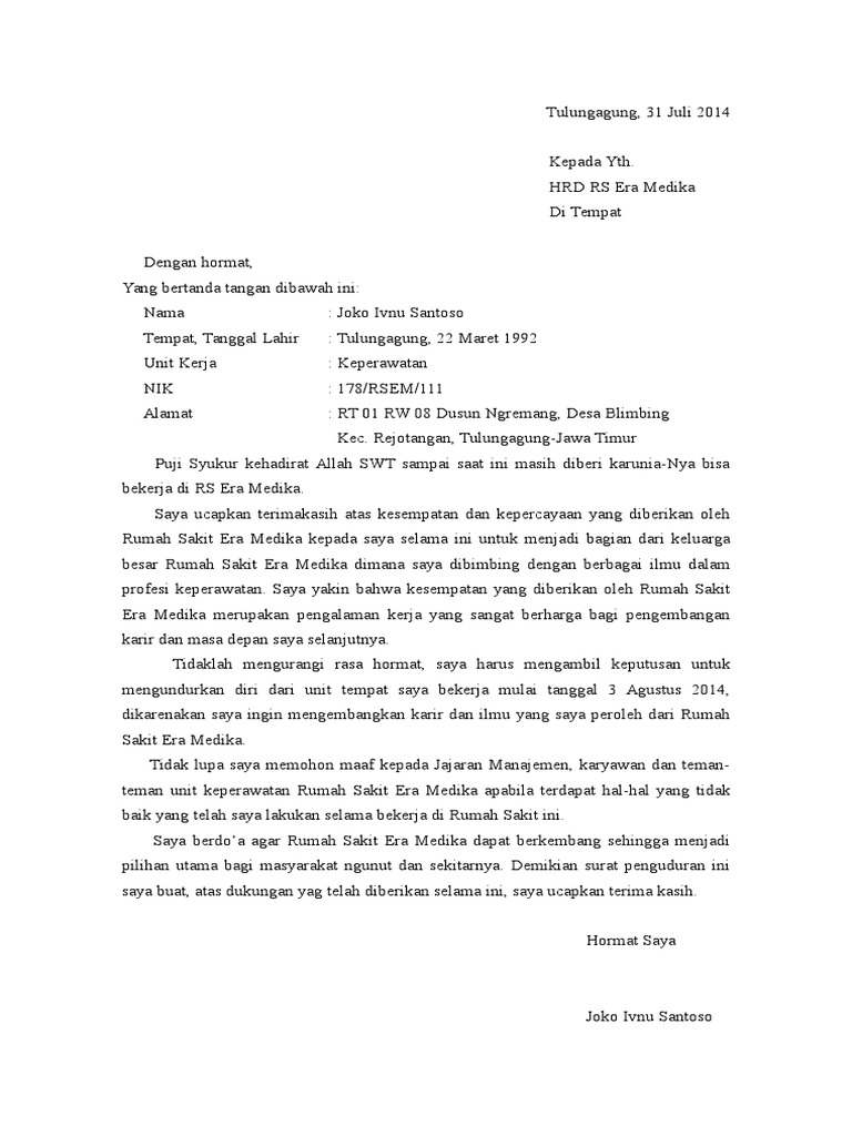Dan harapannya, ia bisa tetap bekerja sampai jangka waktu yang lama bahkan hingga pensiun. Fungsinya adalah untuk melegalkan status tanggung jawab di perusahaan dan persyaratan administratif. Surat ini perlu dibuat karena sudah berdasarkan aturan yang memang berlaku di perusahaan serta berguna untuk saling menjaga. Namun, terkadang untuk menulis surat pengunduran diri tersebut memerlukan banyak contoh atau referensi sehingga bisa menghasilkan isi surat pengunduran diri yang baik. Surat pengunduran diri adalah surat yang menyatakan diri kita berhenti bekerja ataupun mengundurkan diri dari tempat kita bekerja, entah itu bekerja di perusahaan swasta maupun di download surat pengunduran diri.doc. Perawat ruang igd dengan ini mengajukan pengunduran diri saya untuk tidak aktif lagi bekerja pada. Hal ini dikarenakan si penulis menganggap bahwa perusahaannya merupakan perusahaan unggulan, terbukti dengan harapan yang diutarakan dalam surat pengunduran diri. Contoh surat pengunduran diri yang baik ii kepada yth. Contoh surat pengunduran diri berikut ini mungkin bisa dijadikan referensi. Surat ini harus berisi alasan yang logis dan masuk akan agar pengunduran diri kamu dapat diterima dengan baik oleh perusahaan. Surat pengunduran diri berisi pernyataan pengunduran diri seseorang dari suatu jabatan karena faktor. Contoh surat pengunduran diri kerja. Sebagai salah satu jenis surat penting yang ditujukan untuk memutuskan hubungan kerja dengan perusahaan.