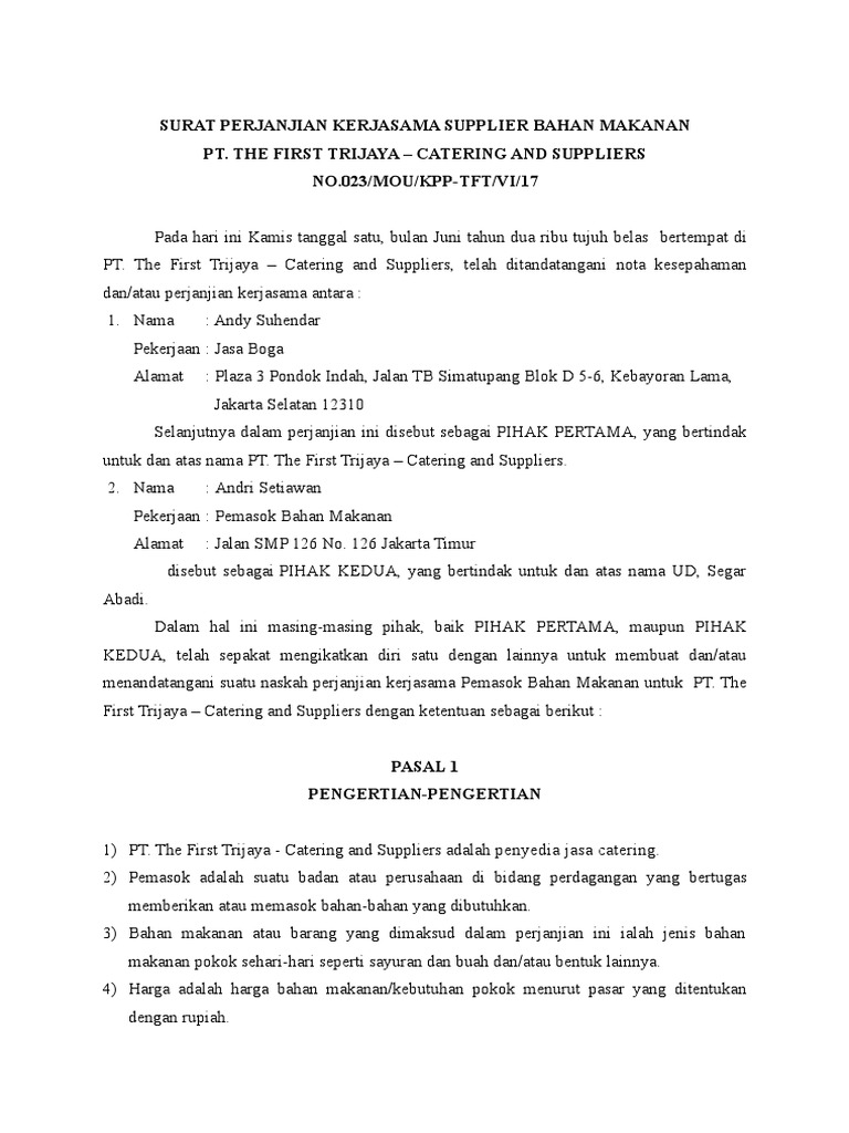 Supplier terbagi menjadi dua bagian yaitu supplier barang dan supplier jasa. Contoh surat perjanjian agen atau distributor mou. Contoh surat pemutusan kerjasama dengan vendor kumpulan surat penting. Supplier barang berfungsi untuk memasok bahan baku sementara supplier jasa berfungsi sebagai jasa yang membantu pengolahan bahan baku. Doc perjanjian kontrak kerjasama pengadaan beras kebutuhan. 13 contoh surat penawaran lengkap jasa kerjasama barang. Contoh surat perjanjian kerjasama penggaduhan ayam potong portalinvestasi com. Akta pendirian perusahaan, perubahannya beserta sk menkumham e. Contoh perjanjian dan addendum program kemitraan ayam pedaging rohmadfapertanian peternakan kediri. Direktur pt.trikama boga alamat : Surat perjanjian titip jual konsinyasi contoh. Surat perjanjian kerjasama usaha komoditas tomat karinov web services pada hari ini, kamis tanggal dua bulan agustus, tahun dua ribu delapan belas ( 2 agustus 2018) bertempat di kota bandung, telah ditandatangani perjanjian kerjasama antara : Dalam sebuah kesepakatan baik itu dilakukan antar perorangan atau perusahaan adanya perjanjian dalam bentuk tertulis adalah hal yang utama.