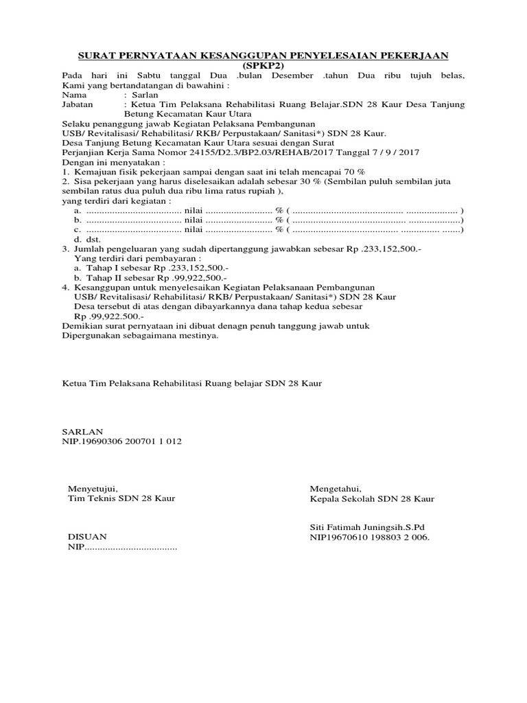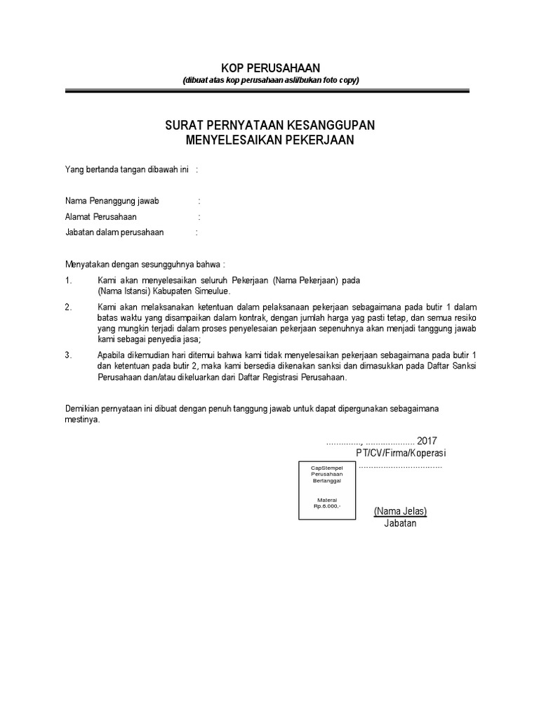 Sebagai contoh, ketika anda menerima jabatan baru atau dipindahtugaskan ke daerah. Ketika pekerjaan sedang menumpuk dan banyak pekerjaan yang belum terselesaikan, maka jalan satu. Rapat tersebut harus menyepakati antara lain, apakah pekerjaan tersebut dianggap perlu dilanjutkan, apakah penyedia memiliki kesanggupan menyelesaikan pekerjaan, dan apakah. Berisi contoh surat pernyataan lengkap dengan formatnya. Surat pernyataan kesanggupan harus mencatumkan sebuah pernyataan secara jelas akan kesanggupan untuk melakasanakan tugas yang akan diberikan serta mau menanggung resiko apapun baik berupa hukuman atau hal lainnya jika terbukti bersalah atau gagal dalam menjalankan tugas.