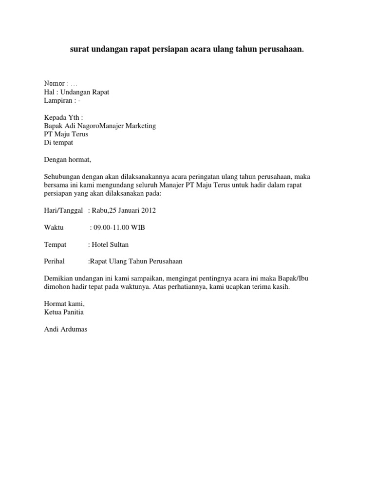 Contoh Surat Undangan Ulang Tahun Perusahaan from imgv2-2-f.scribdassets.com Surat undangan rapat dapat dibuat oleh organisasi kemahasiswaan. Dalam rangka akan diadakannya agenda tahunan untuk memperingati hari ulang tahun perusahaan yang ke 28, maka kami bermaksud untuk mengundang. Surat undangan resmi adalah surat undangan yang biasanya dibuat oleh suatu perusahaan atau instansi dalam rangka menyelenggarakan sebuah agenda atau kegiatan yang diadakan dengan mengundang b. Beda halnya juga dengan jenis surat undangan resmi ataupun rapat dan sejenisnya, bahwasannya untuk surat undangan ulang tahun ini sifatnya hanyalah formalitas saja dengan tujuan untuk memberikan sebuah informasi kepada kerabatnya. Untuk itulah surat undangan rapat sangat diperlukan. Dengan hormat, dalam rangka akan diadakannya peringatan ulang tahun perusahaan, maka kami bermaksud mengundang bapak untuk menghadiri acara rapat. Jika kita terjemahkan bebas berikut ini merupakan beberapa contoh surat undangan ulang tahun yang bisa kamu simak demikianlah beberapa contoh surat undangan rapat contoh surat undangan resmi semoga dapat. Jadi tidak hanya melulu dilakukan oleh suatu perusahaan.