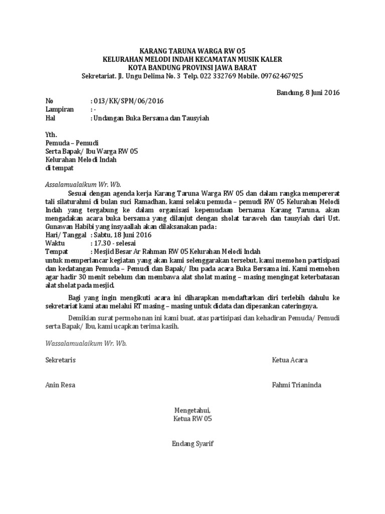 (DOC) Contoh Surat Undangan Rapat Rutin Karang Taruna.docx ... from 0.academia-photos.com 5 contoh surat undangan yang baik dan benar. Contoh surat undangan rapat organisasi. Bagi instansi pemerintahan, khususnya dinas pendidikan tentu akan memiliki banyak agenda rapat. Sebelum membahas contoh surat undangan yang baik dan paling lengkap. Sehingga memudahkan koordinasi antar oraganisasi karang taruna maupun kepada instansi. Report contoh surat undangan karang taruna.docx. Namun tentu saja ada banyak hal yang harus dipersiapkan, baik oleh panitia dan di bawah ini adalah contoh surat undangan rapat karang taruna yang bisa anda gunakan. Informasi undangan yang kami bagikan semoga menjadi informasi terbaik dan bisa benrmanfaat untuk semua khususnya informasi tentang download contoh kop surat karang taruna terbaru 2020 yang semuanya kami kumpulkan dengan serapih mungkin.